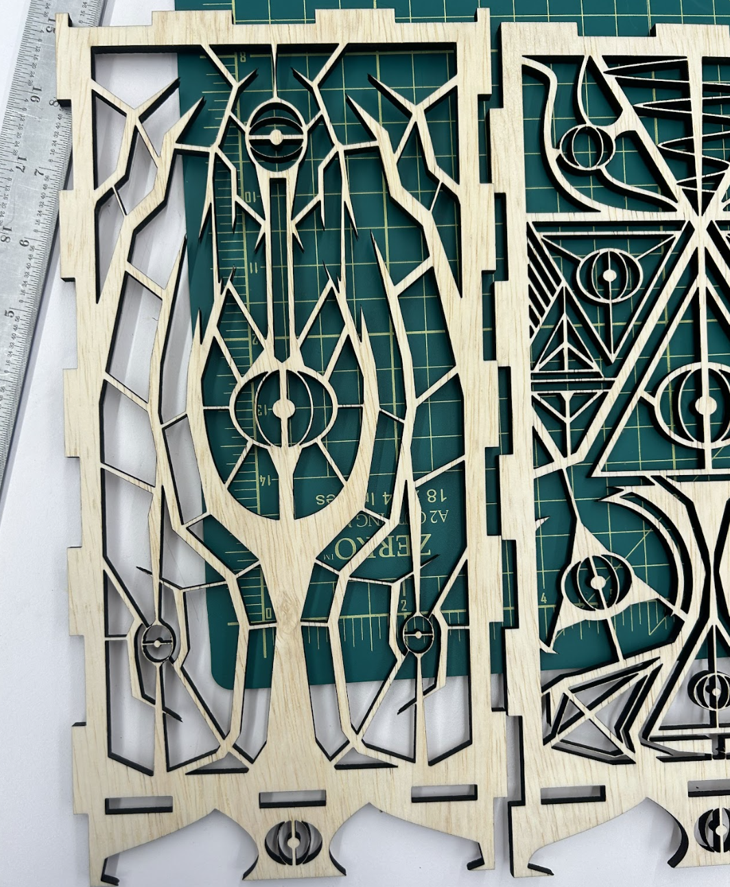 Process of making the Lamp: Rough sketches of the design to plan out my ideas: Designed in Fusion 360 based on the sketches. Some renders of the lamp before building it: Laser-cut the six different designs for each lamp shade panel on wood: Putting the lamp shade together: Final lamp shade:
